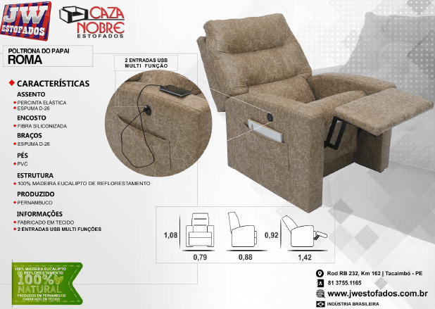 Linda Poltrona do Papai com o novo sistema de entrada Dupla USB, praticidade e conforto, produzida com fibra siliconizada e percintas elásticas e exclusivo porta revisteiro lateral.